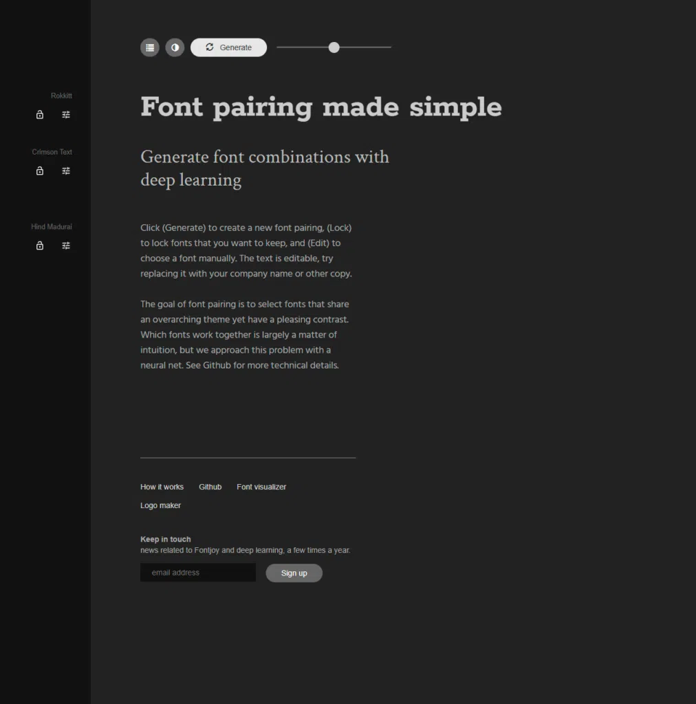A Fontjoy mesterséges intelligenciával segít a harmonikus betűtípus-párosítások megtalálásában. Az eszköz ideális azok számára, akik professzionális tipográfiai megoldásokat keresnek, anélkül hogy mély tipográfiai ismeretekkel rendelkeznének.