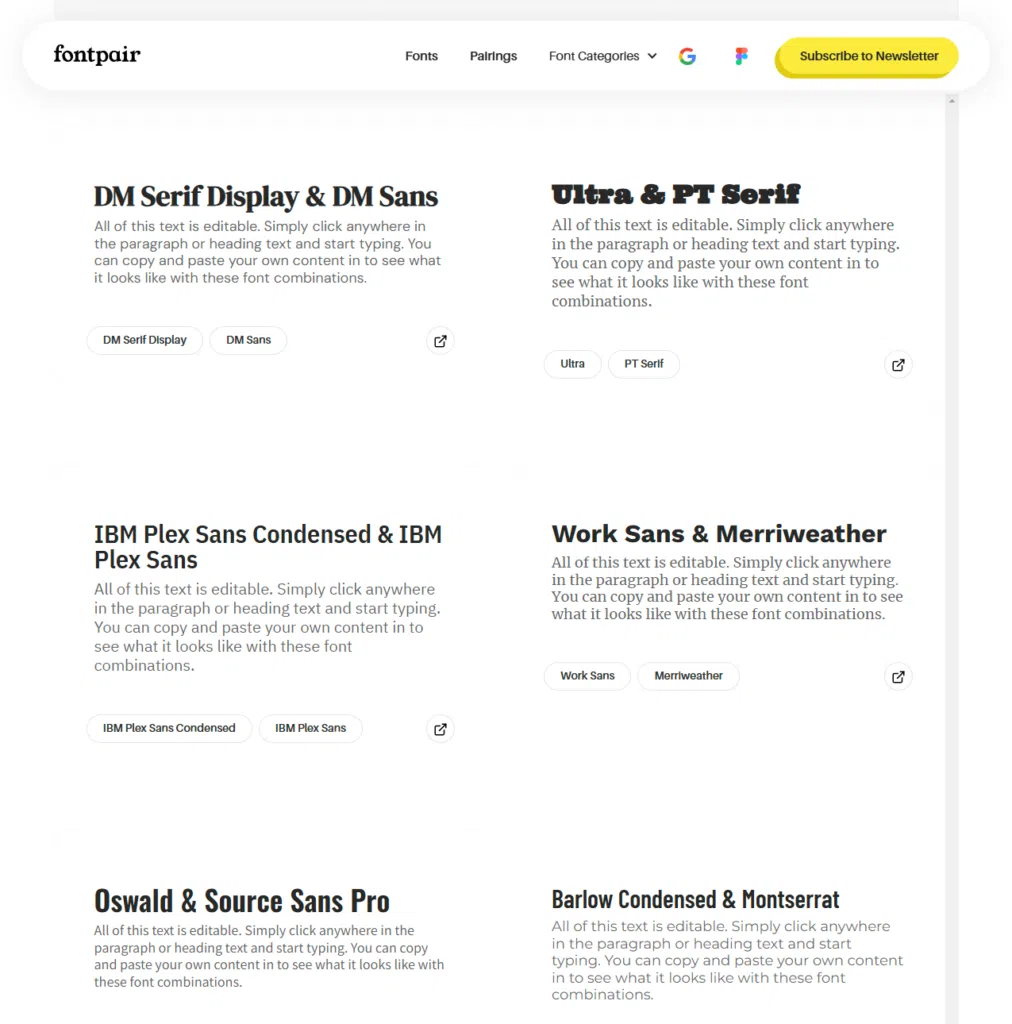 A Font Pair egy ingyenes platform, amely kimondottan Google Fonts betűtípusok párosítására specializálódott. Könnyedén böngészhetsz különböző kategóriák és stílusok között, hogy megtaláld a tökéletes kombinációt a projekthez.