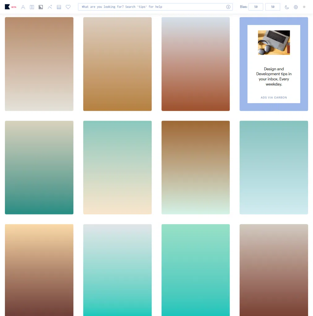 Színkombinációk és gradiensek generálása.