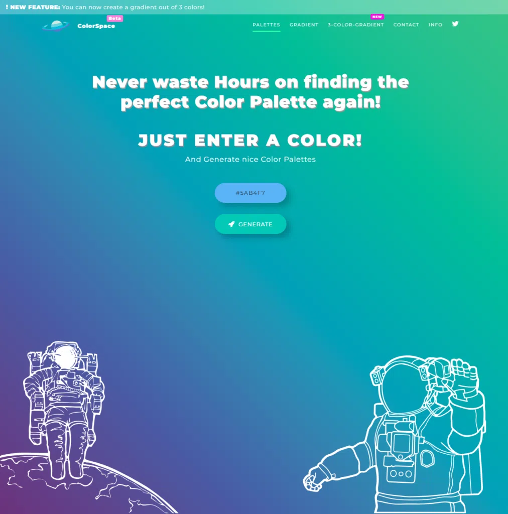 A ColorSpace személyes kedvencem. Ha van egy meghatározott színed, amely köré szeretnéd építeni a dizájnt, ez az eszköz rengeteg harmonikus kombinációt kínál. Egyszerűen add meg a színt hex kóddal vagy válaszd ki a színkeréken, és máris felfedezheted a lehetőségeket.